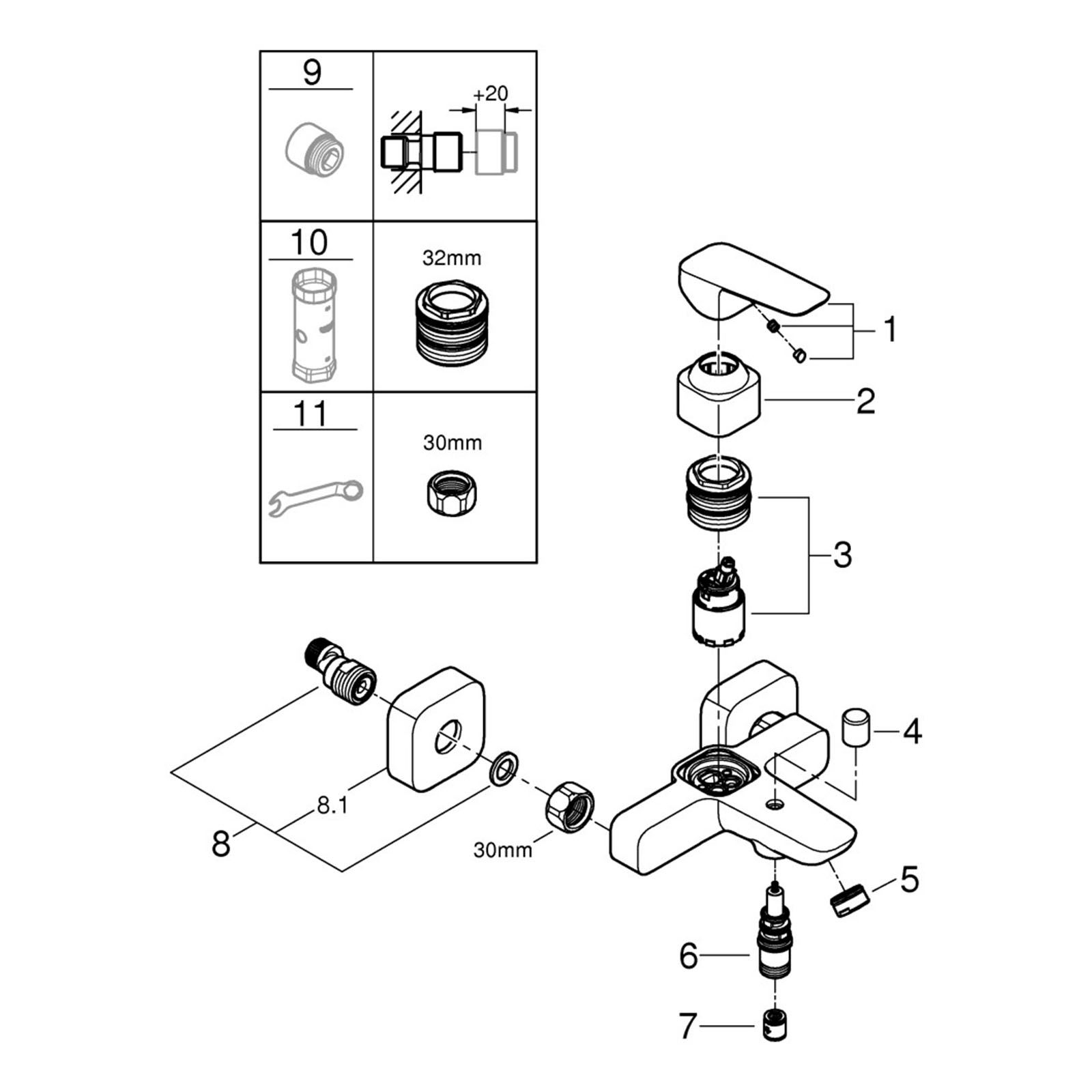 - 1 x Grohe Cubeo Einhand-Wannenbatterie S-Anschlüsse Wandmontage Chrom 1018130000