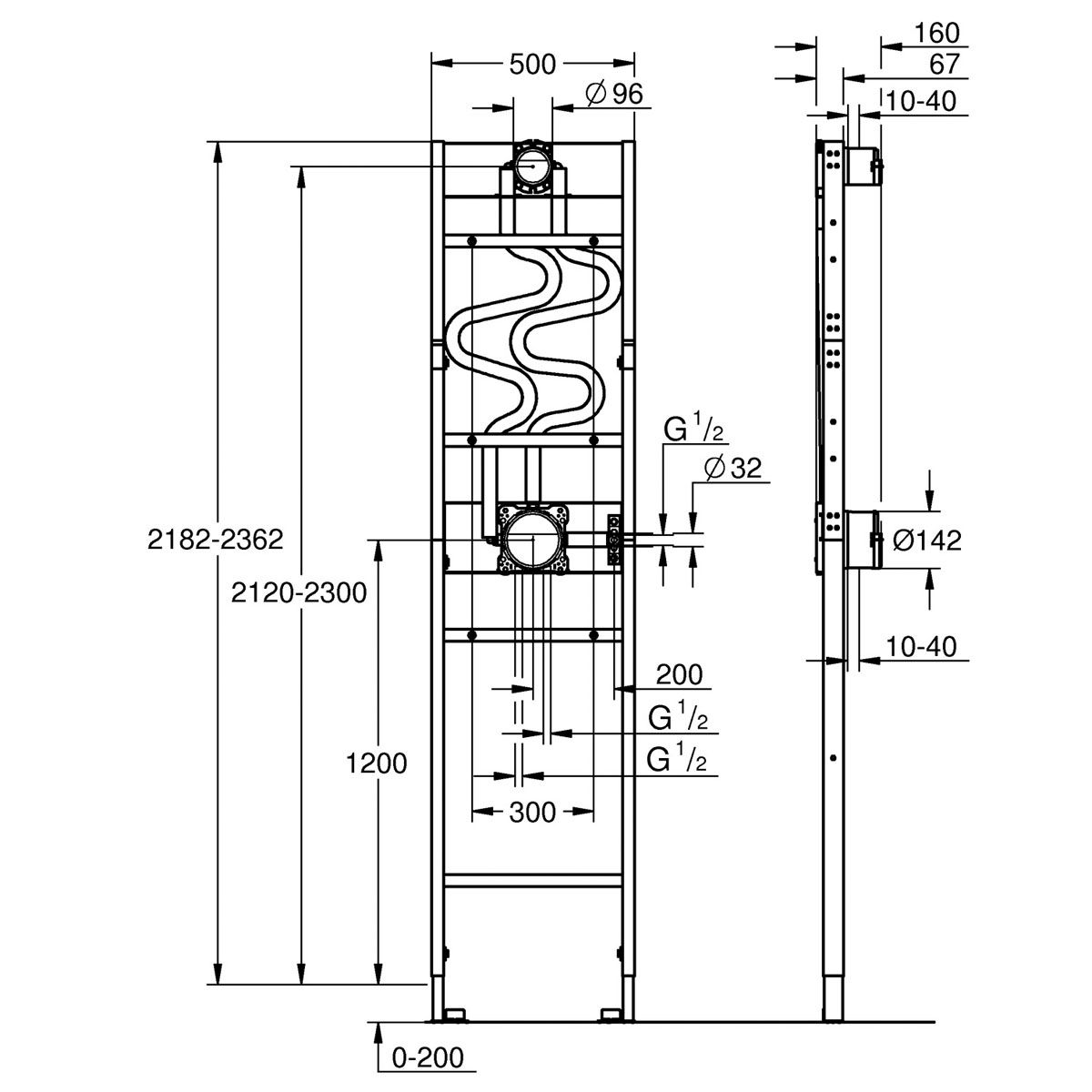 - Mindest-Installationstiefe (von der Wand bis zur Rahmenfront): 67 mm