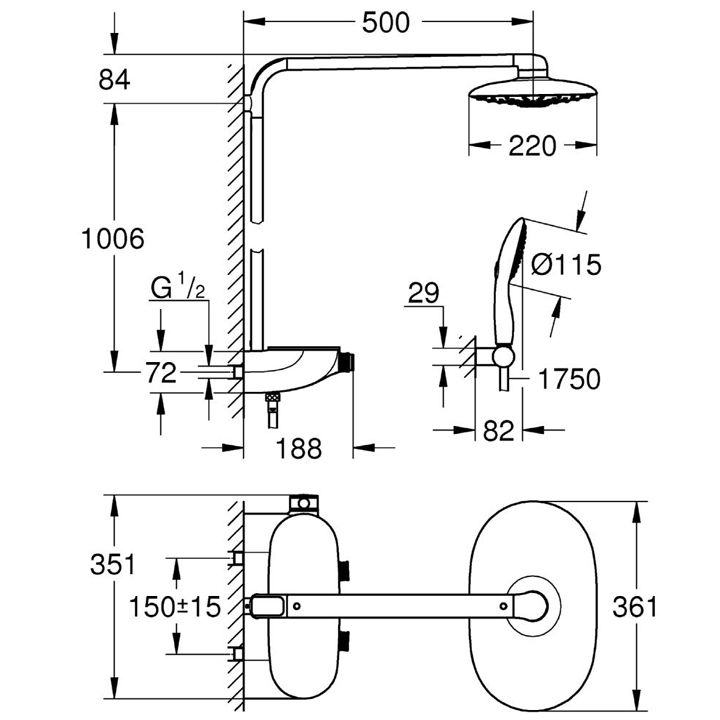 - horizontaler Duscharm: 500 mm