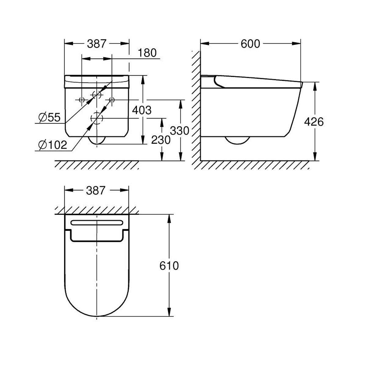 - GROHE Power flush: spülrandlose GROHE Triple Vortex Spül-Technologie
