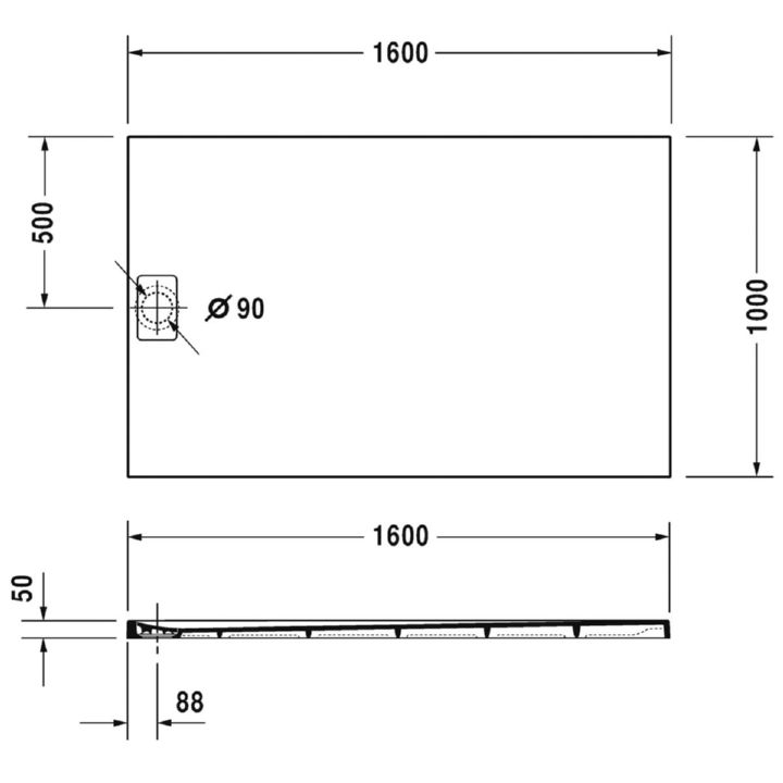 - integrierter und verdeckter Ablauf: Ø 90 mm