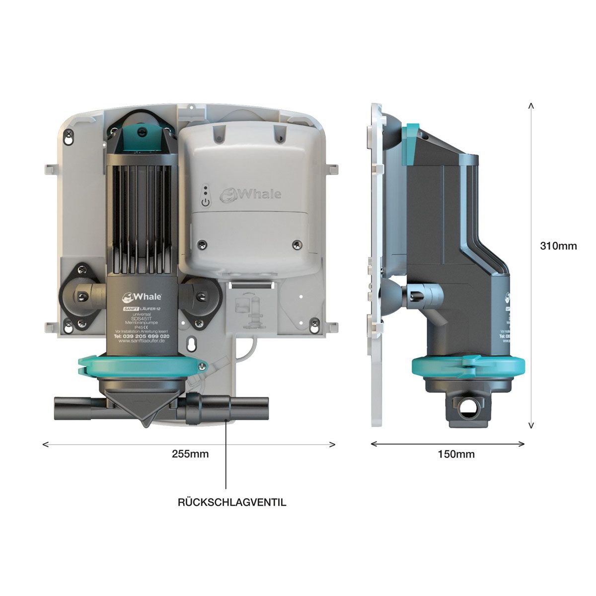 - Maße Pumpe auf Montageplatte (HxBxT): 255 x 310 x 150 mm