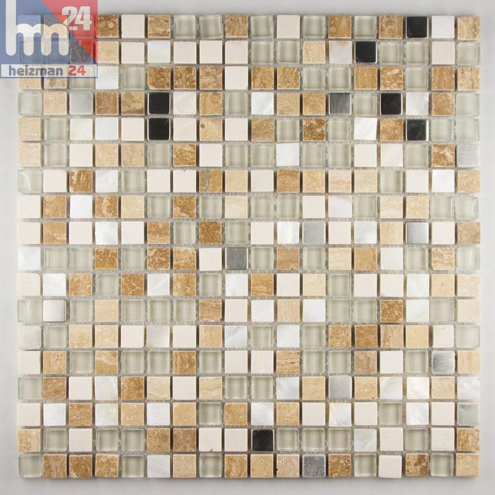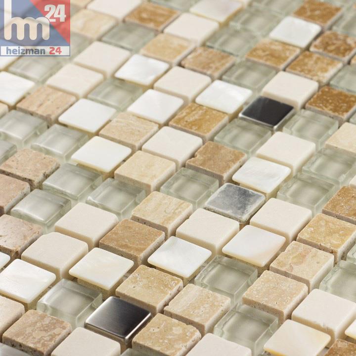 Weiterführende Links zu "Glasmosaik Mendoza Naturstein Metall Elemente silber weiß transparent beige braun Bad Küche Dusche"