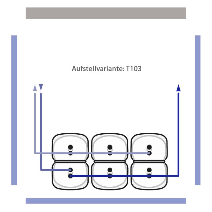 - bei ein- und zweireihiger Aufstellung: an einer Stirnseite 400 mm alle anderen 50 mm Wandabstand