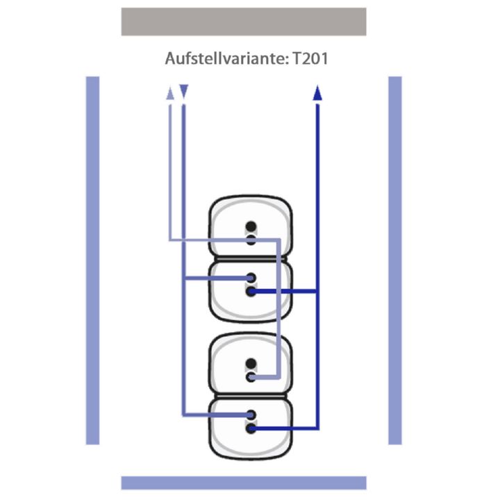 - bei ein- und zweireihiger Aufstellung: an einer Stirnseite 400 mm alle anderen 50 mm Wandabstand