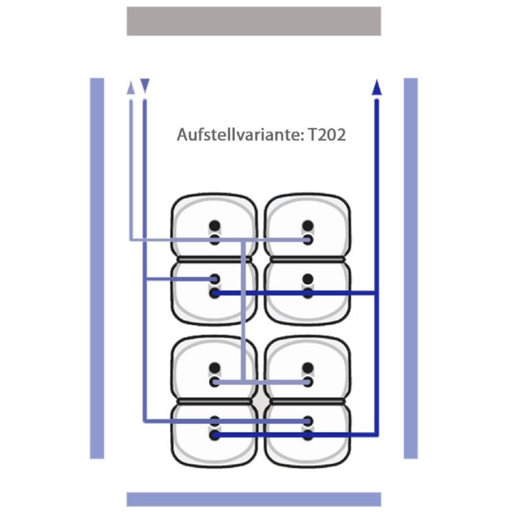 - bei ein- und zweireihiger Aufstellung: an einer Stirnseite 400 mm alle anderen 50 mm Wandabstand