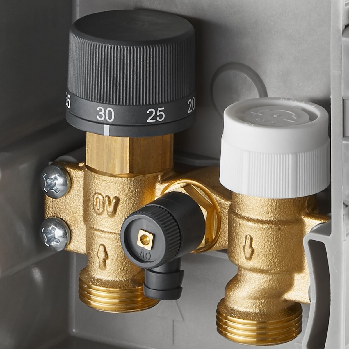 - in Kombination mit einem Thermostat mit Fernversteller oder einem Stellantrieb mit Raumthermostat ist eine Einzelraumtemperaturregelung möglich