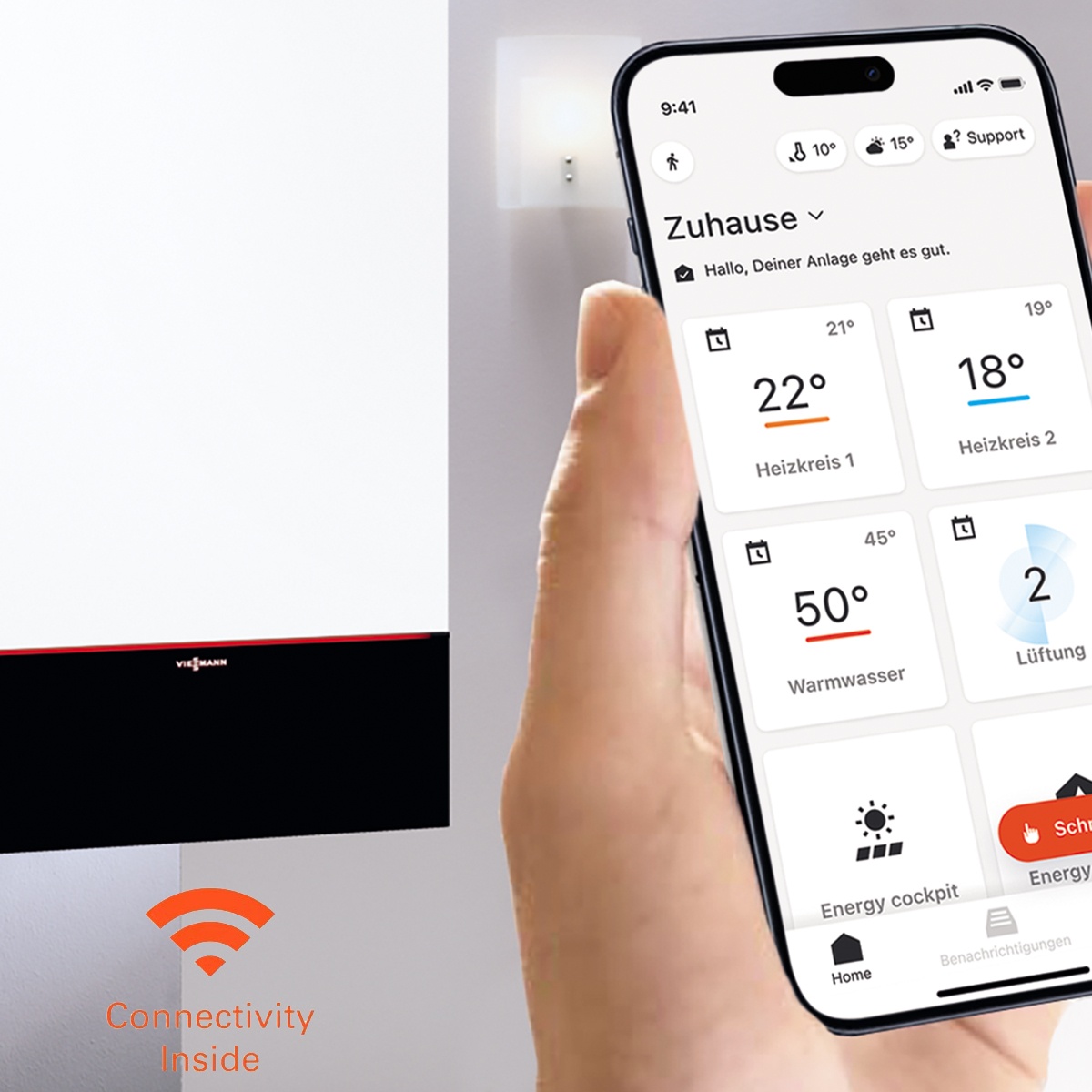 - Einzelraumregelung über ViCare App für bis zu 20 Räume in Kombination mit ViCare Smart Climate (Zubehör, nicht im Lieferumfang enthalten)