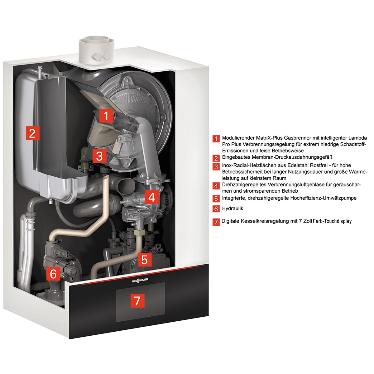 - modulierender MatriX-Plus Gasbrenner mit intelligenter Lambda Pro Plus Verbrennungsregelung für extrem niedrige Schadstoffemissionen und leise Betriebsweise