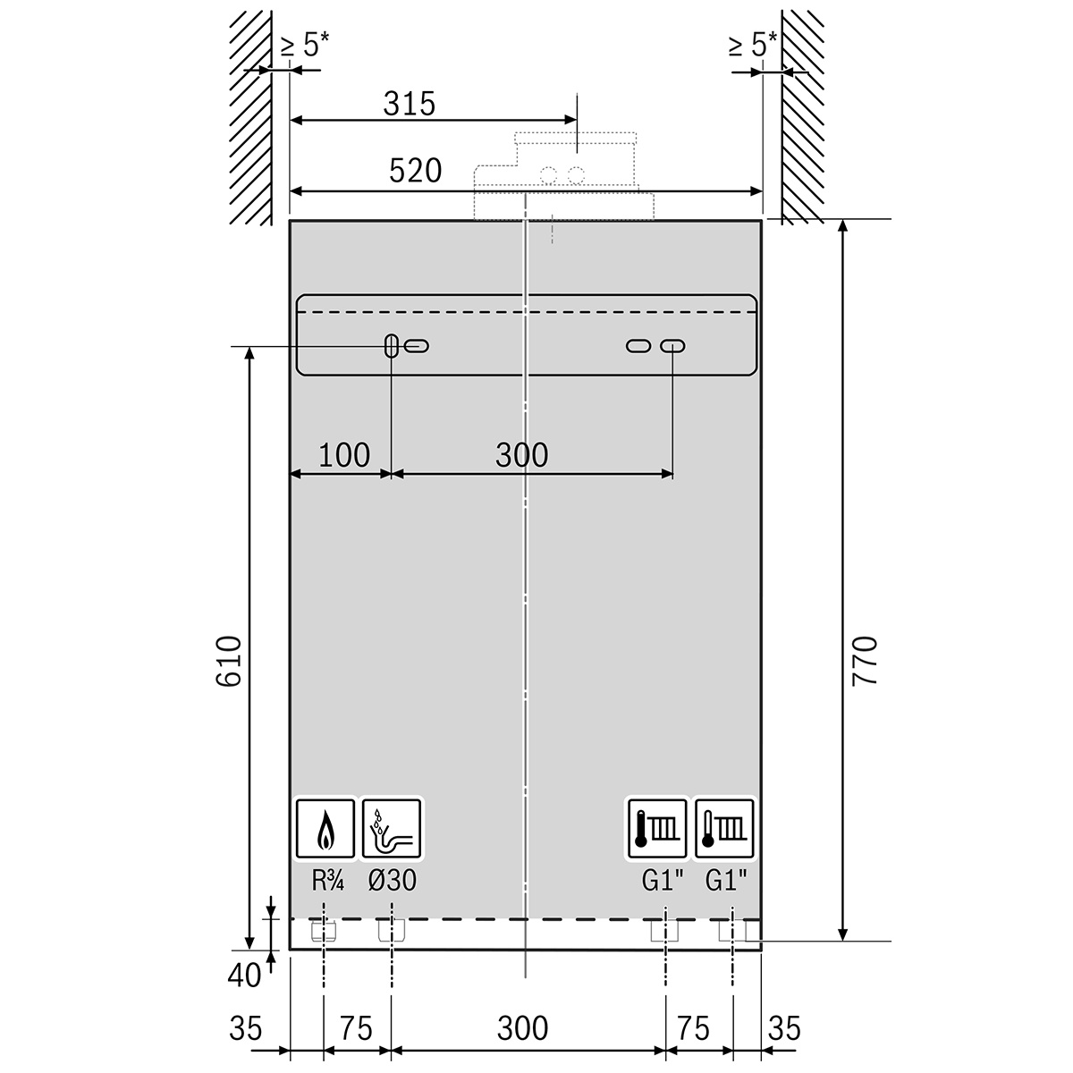 - Maße: Gas-, Vorlauf-/Rücklaufanschluss und Abgasanschlussstück kompatibel zu Altgeräten GB112-24/30, GB142-15/24/30 und GB162-15/25/35/45 oder GB192i