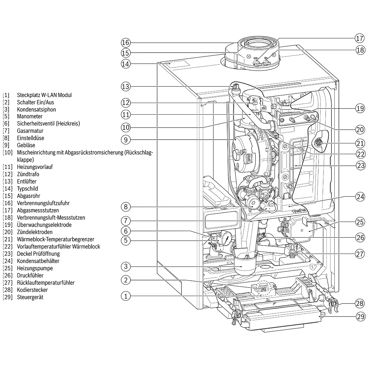 - bestehend aus Gas-Brennwertgerät, Systembedieneinheit Logamatic BC400 (bereits integriert in die Gerätefront), Aufhängeschiene, Außentemperaturfühler, Schraube Geräteverkleidung, Seitenblende und Produktdokumentation