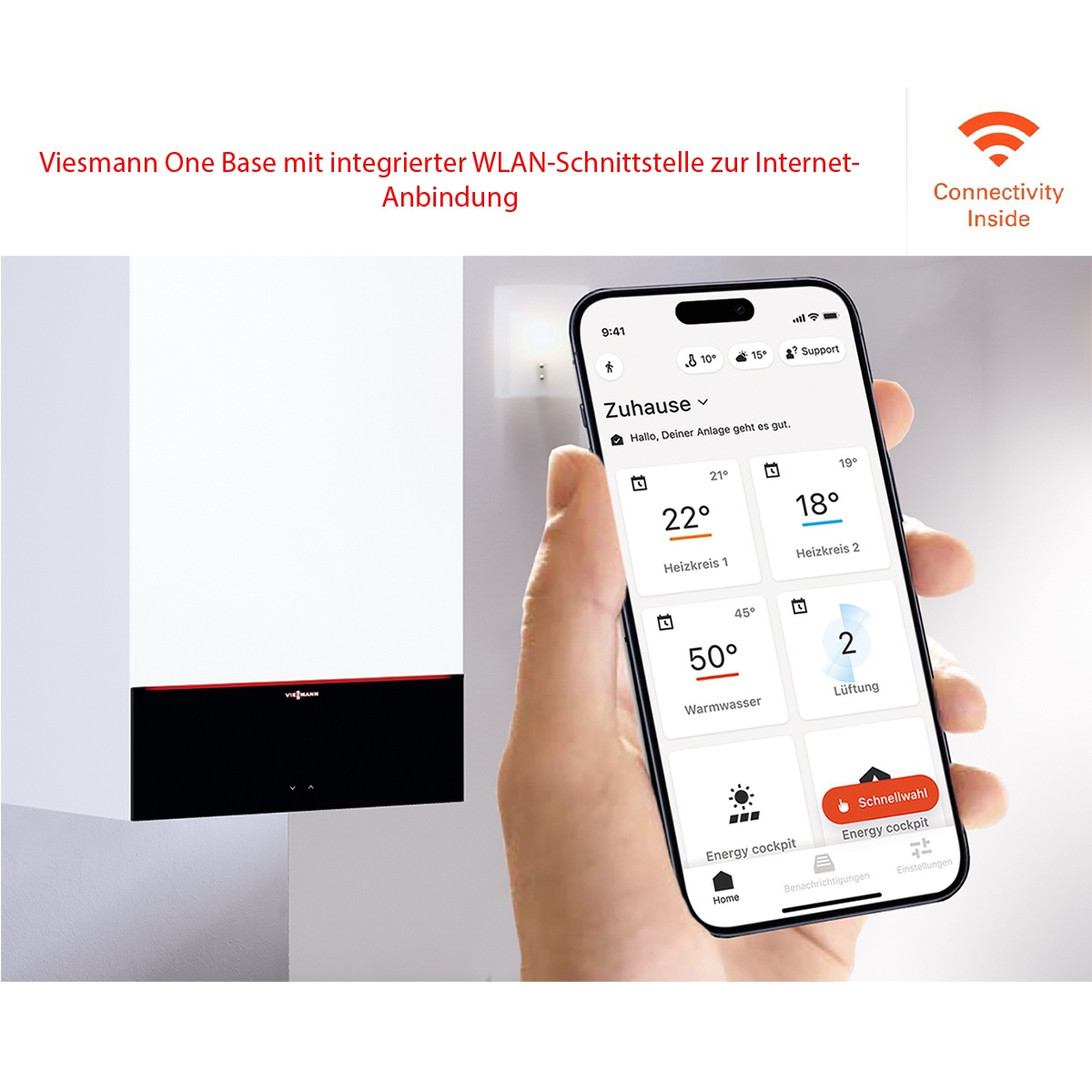 - Fernbedienung und Überwachung des Geräts über Smartphone mit der ViCare App in Verbindung mit integrierter Internetschnittstelle und bauseitigem Internetzugang über WLAN möglich