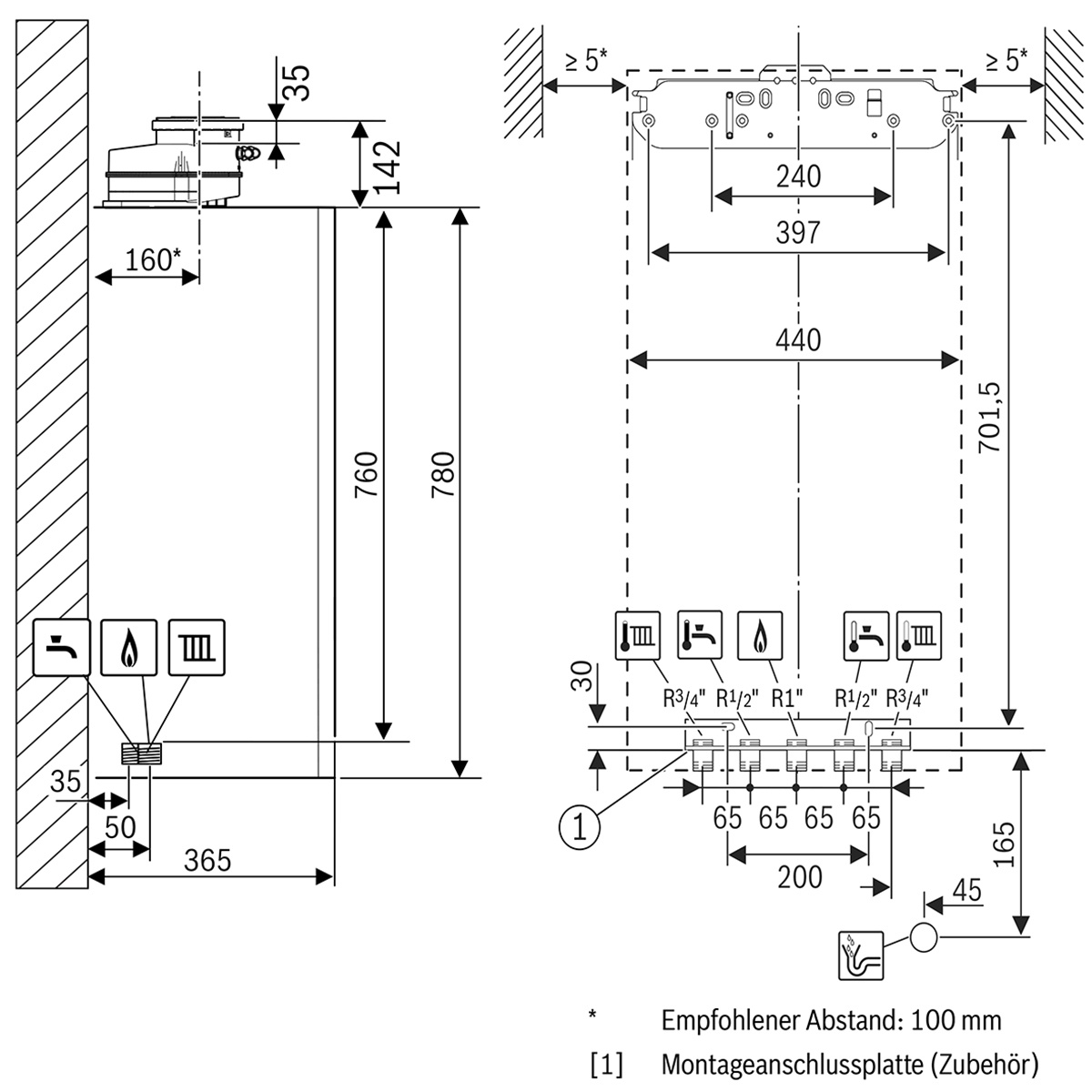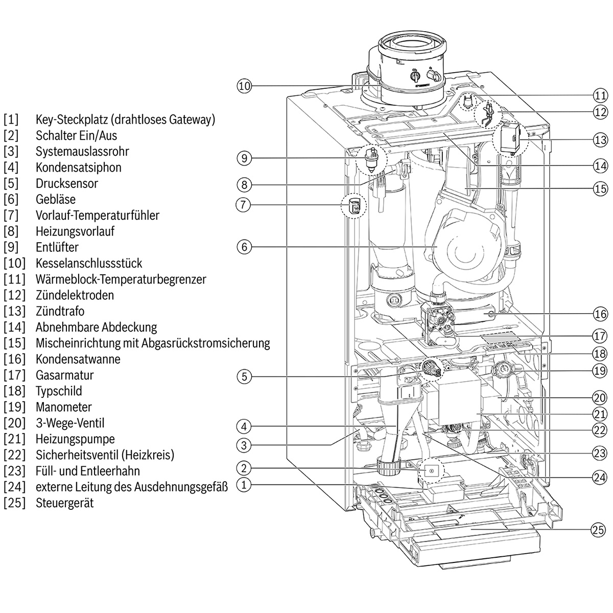 - bestehend aus Gas-Brennwertgerät, Systembedieneinheit Logamatic BC400 (bereits integriert in die Gerätefront), Aufhängeschiene, Außentemperaturfühler, Schlauch-Sicherheitsventil und Druckschriftensatz zur Produktdokumentation