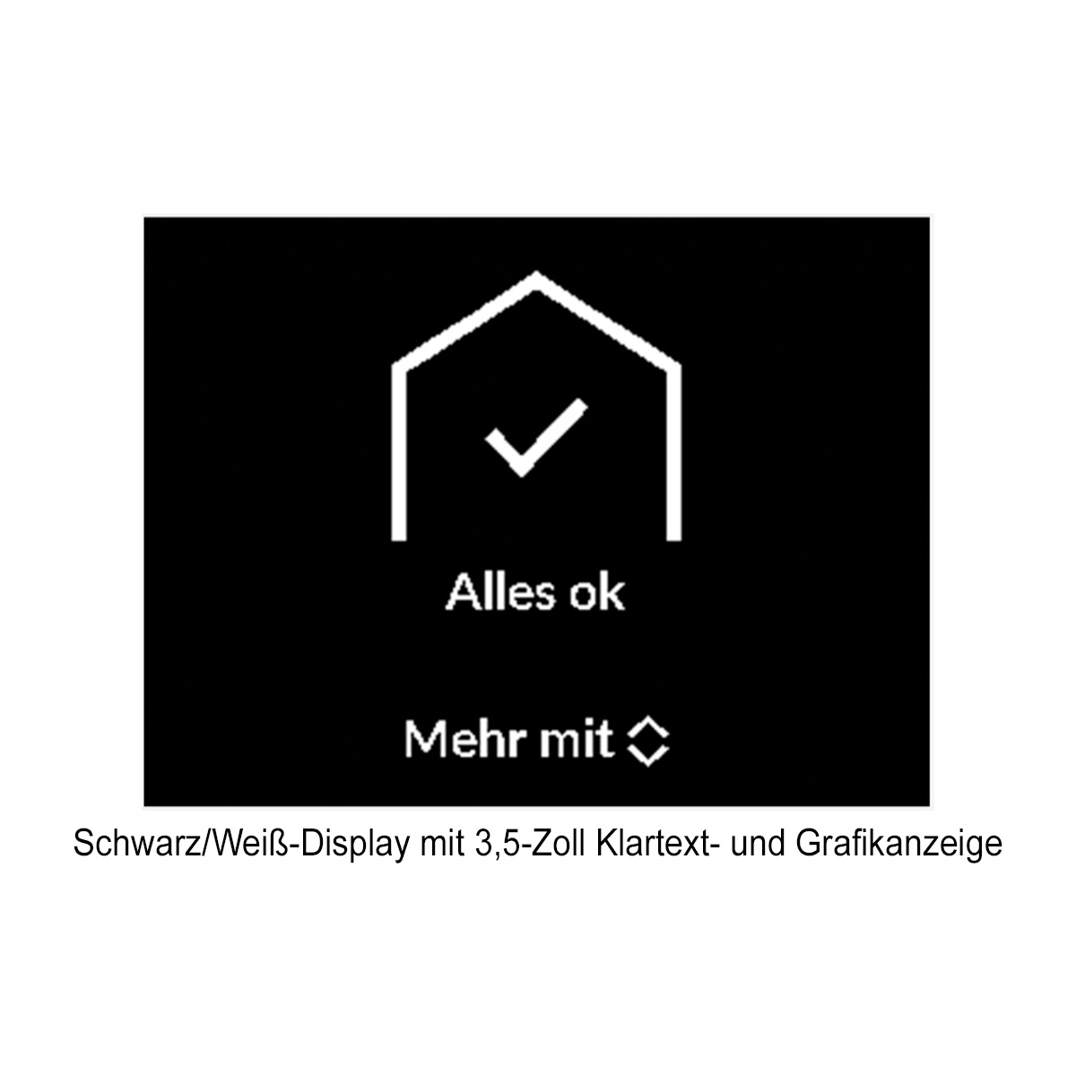 - Bedienung über 3,5-Zoll-Schwarz/Weiß-Display mit Klartext- und Grafikanzeige, großer Schrift und kontextbezogener Hilfe, Betriebs- und Störungsanzeige, Inbetriebnahme-Assistenten, Anzeigen für Energieverbräuche sowie alternativ Bedienung über mobiles Endgerät