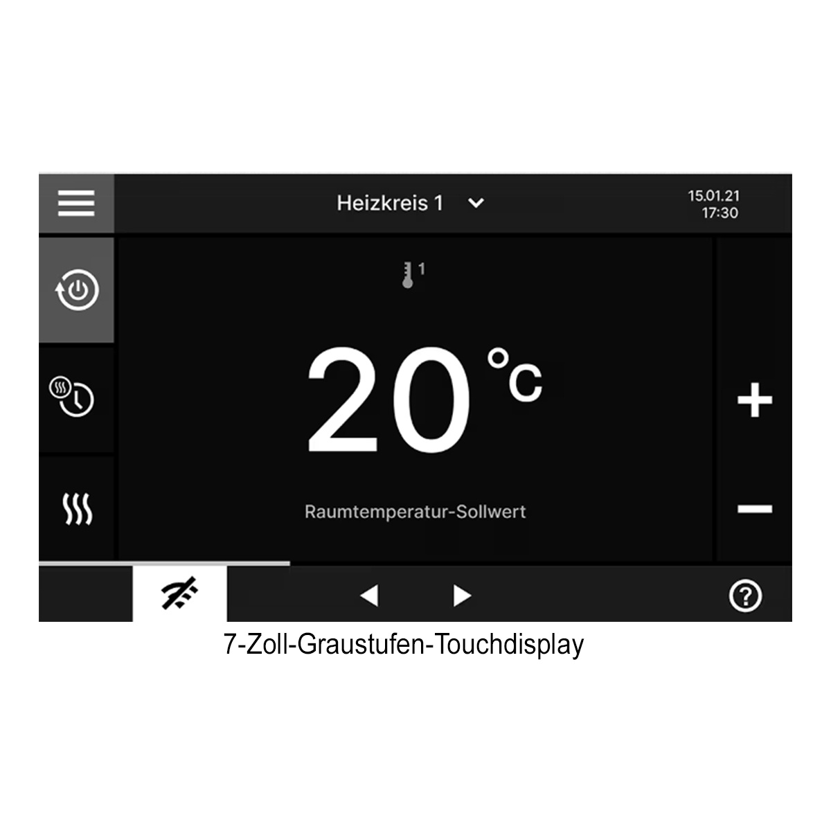 - versetzbares Display 7 Zoll mit Klartext- und Grafikanzeige (Schwarz/Weiß), Inbetriebnahme-Assistenten, Anzeigen für Energieverbräuche sowie alternative Bedienung über ein mobiles Endgerät