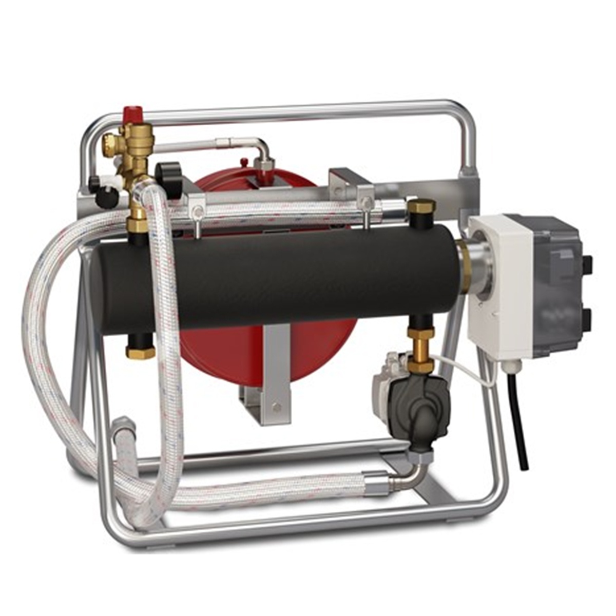- der Anschluss an den Heizkreisverteiler bzw. am Heizsystem erfolgt einfach mit einem flexiblen, Stahl umflochtenen Schlauch 1"