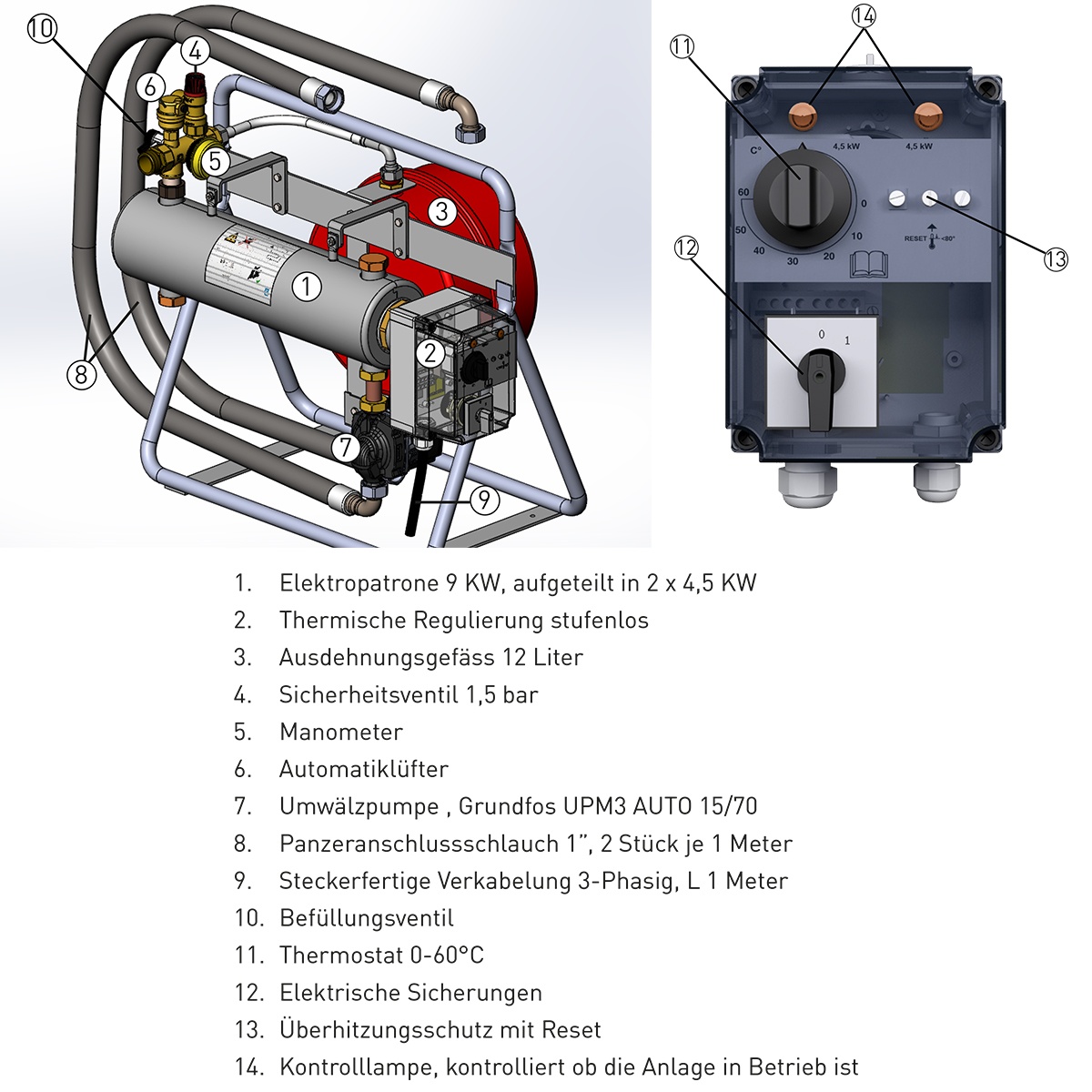 - Ladepumpe: Grundfos UPM3 Auto 15/70 / 1 Phase 230 Volt (an Kontrollbox angepasst)