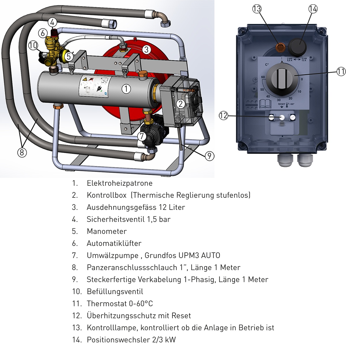 - Ladepumpe: Grundfos UPM3 Auto 15/70 / 1 Phase 230 Volt (an Kontrollbox angepasst)