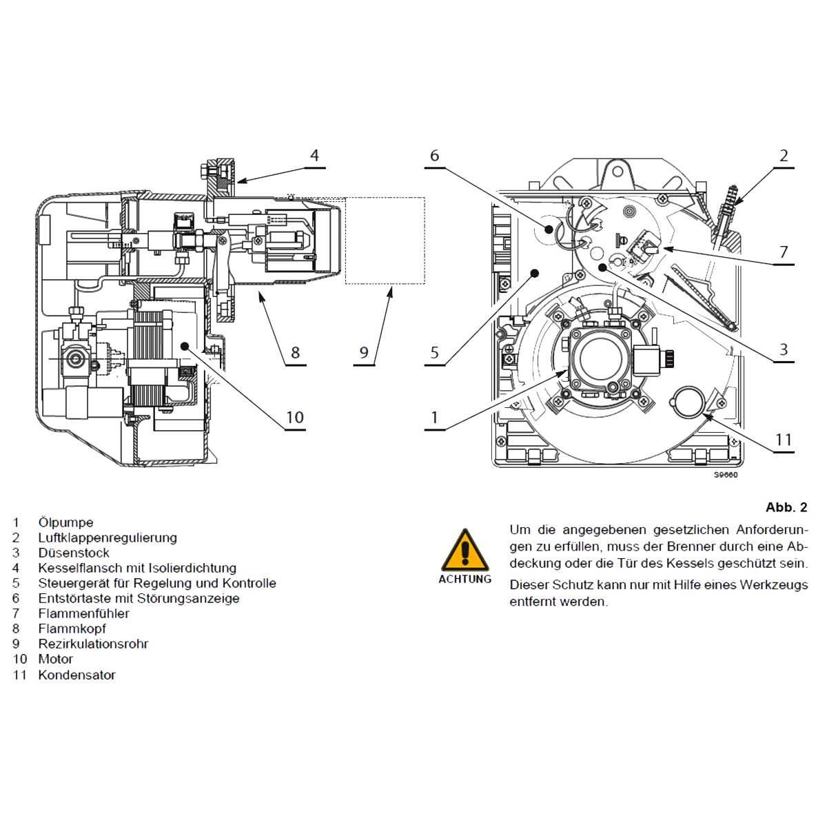 - bestehend aus: 2x Ölschläuche und 2x Anschlussnippel für den Anschluss an die Ölversorgung, Flansch, Brennerflanschdichtung, Schrauben und Muttern für die Befestigung, 7-poliger Anschlussstecker Stufe 1 im Steuergerät integriert (ohne Gegenstecker), Anleitungen für Installation, Bedienung und Wartung, Ersatzteilliste