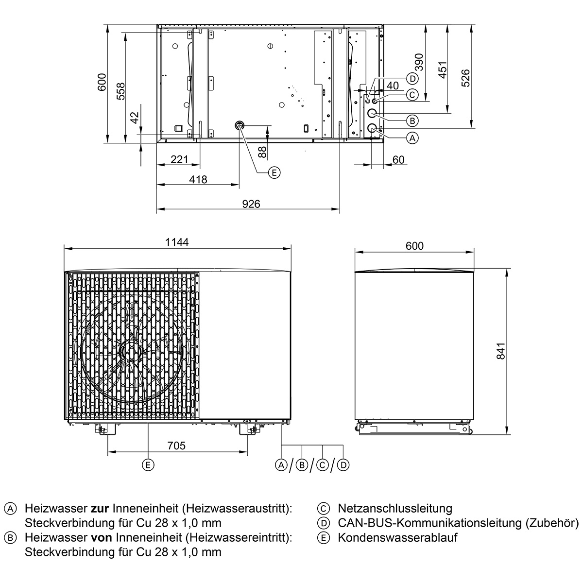| Heizwasservorlauf/-rücklauf Außeneinheit | mm | Cu 28 x 1,0 | ||||