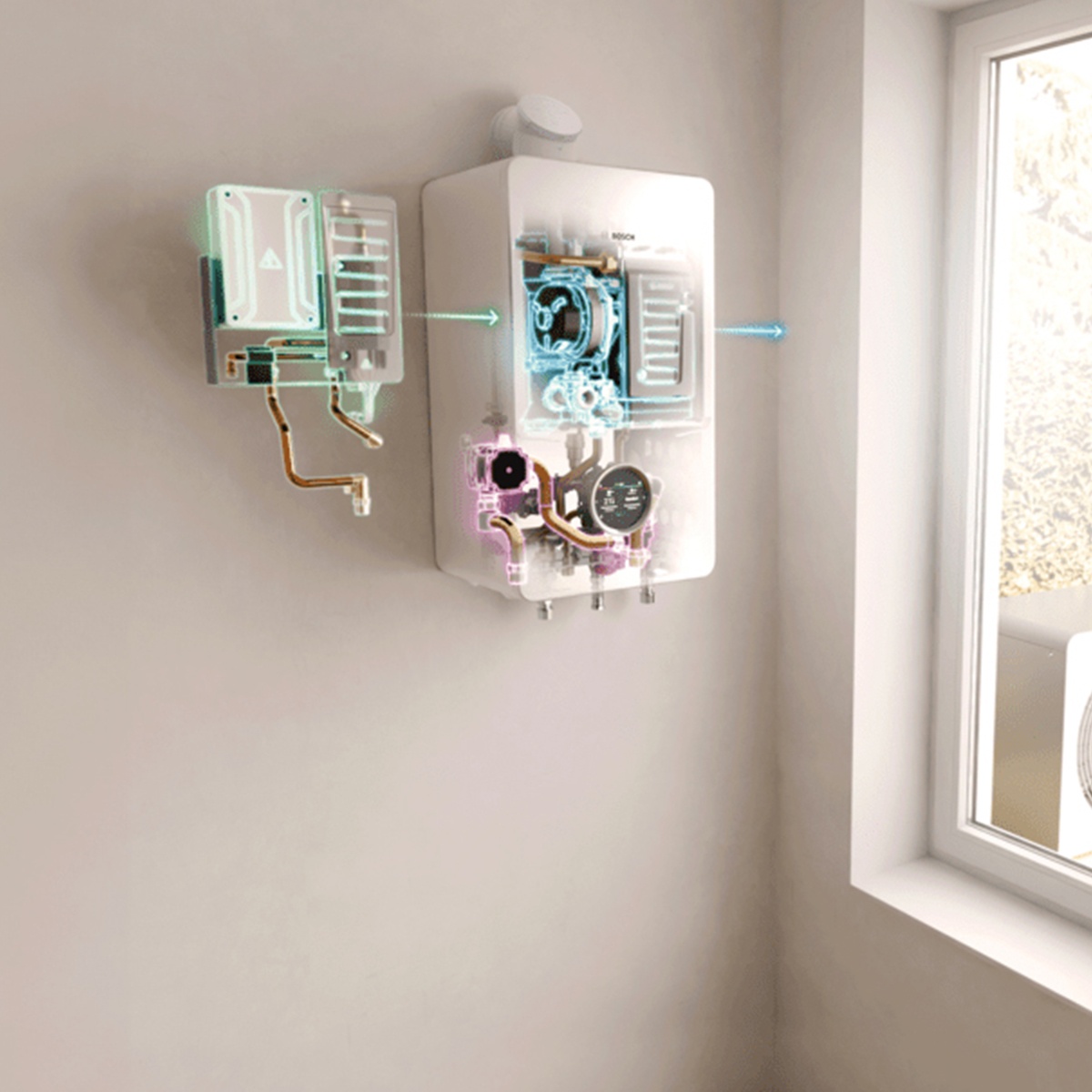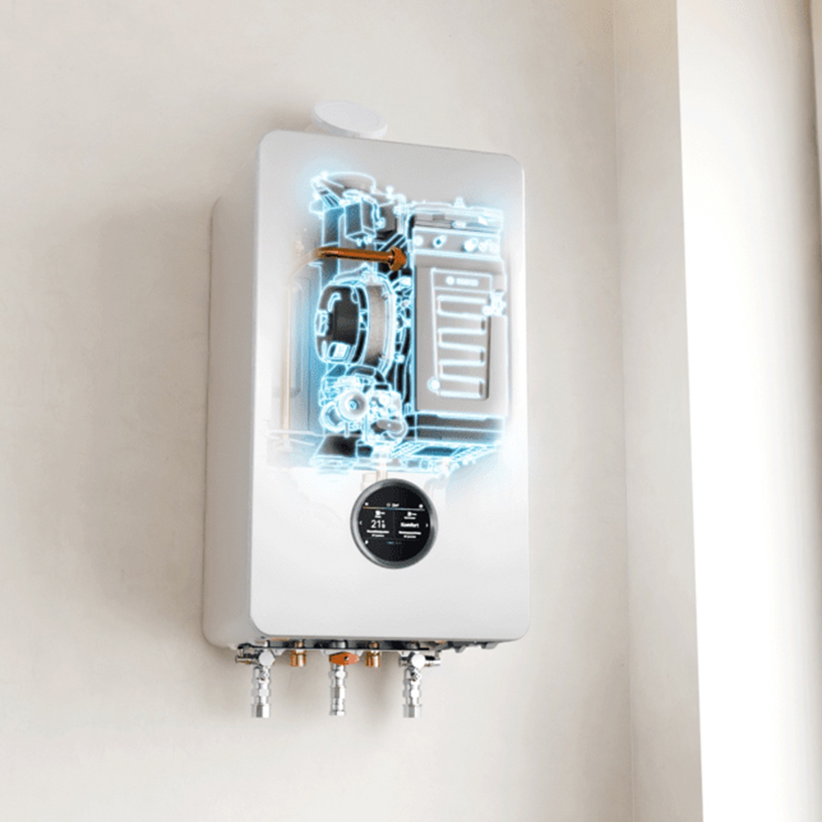 - Betrieb mit Gas, Wasserstoff, als Hybrid oder als 100%ige Wärmepumpen-Inneneinheit möglich