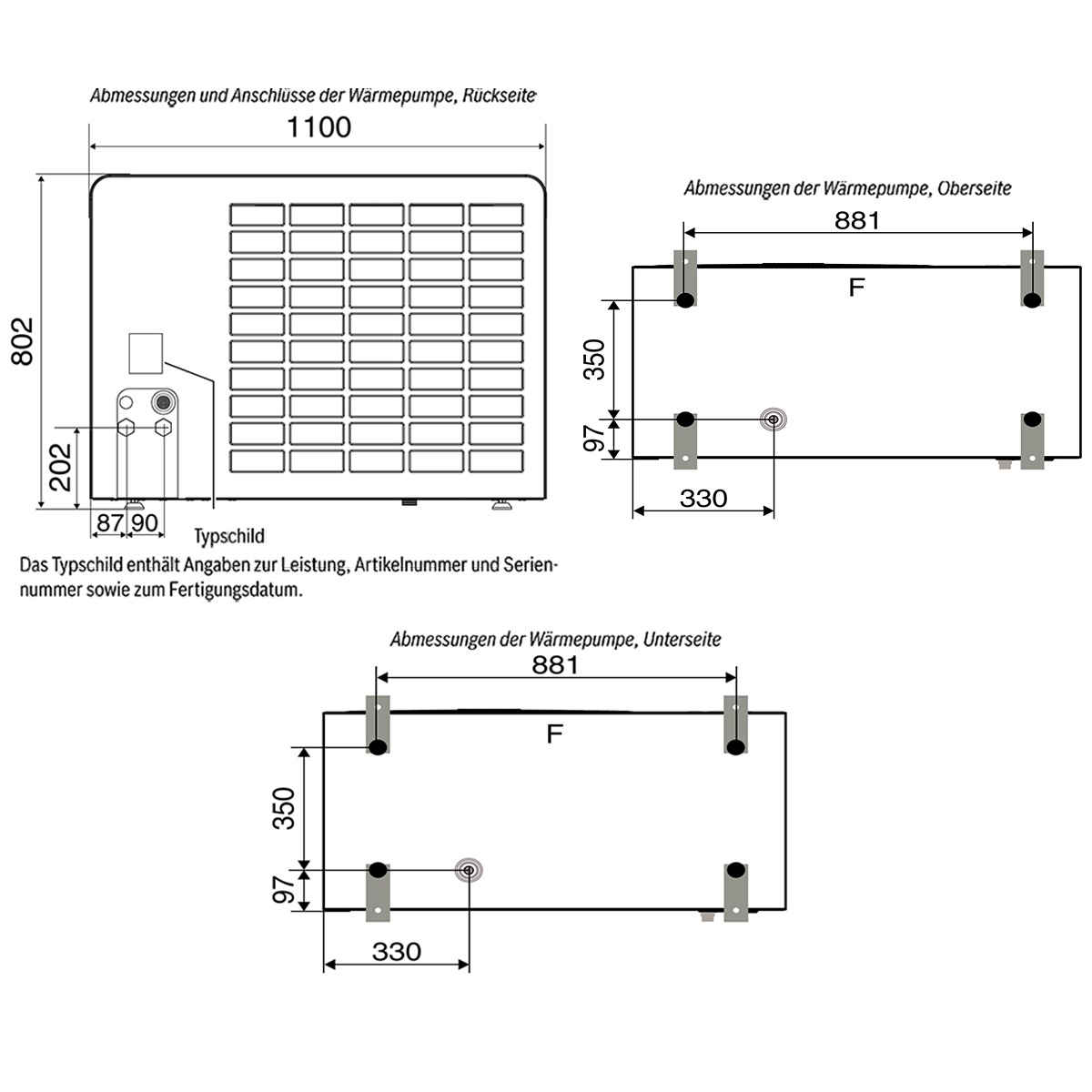 - bestehend aus Wärmepumpe, Kondensatablaufstutzen, Transportgurte, Bodenhalterungen, Kabelbinder zum Fixieren der Kabel im Anschlusskasten bei der Installation und Produktdokumentation