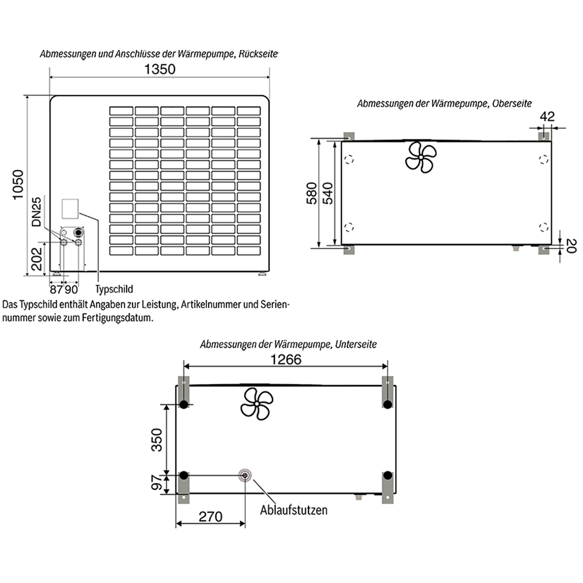 - bestehend aus Wärmepumpe, Kondensatablaufstutzen, Transportgurte, Bodenhalterungen, Kabelbinder zum Fixieren der Kabel im Anschlusskasten bei der Installation und Produktdokumentation