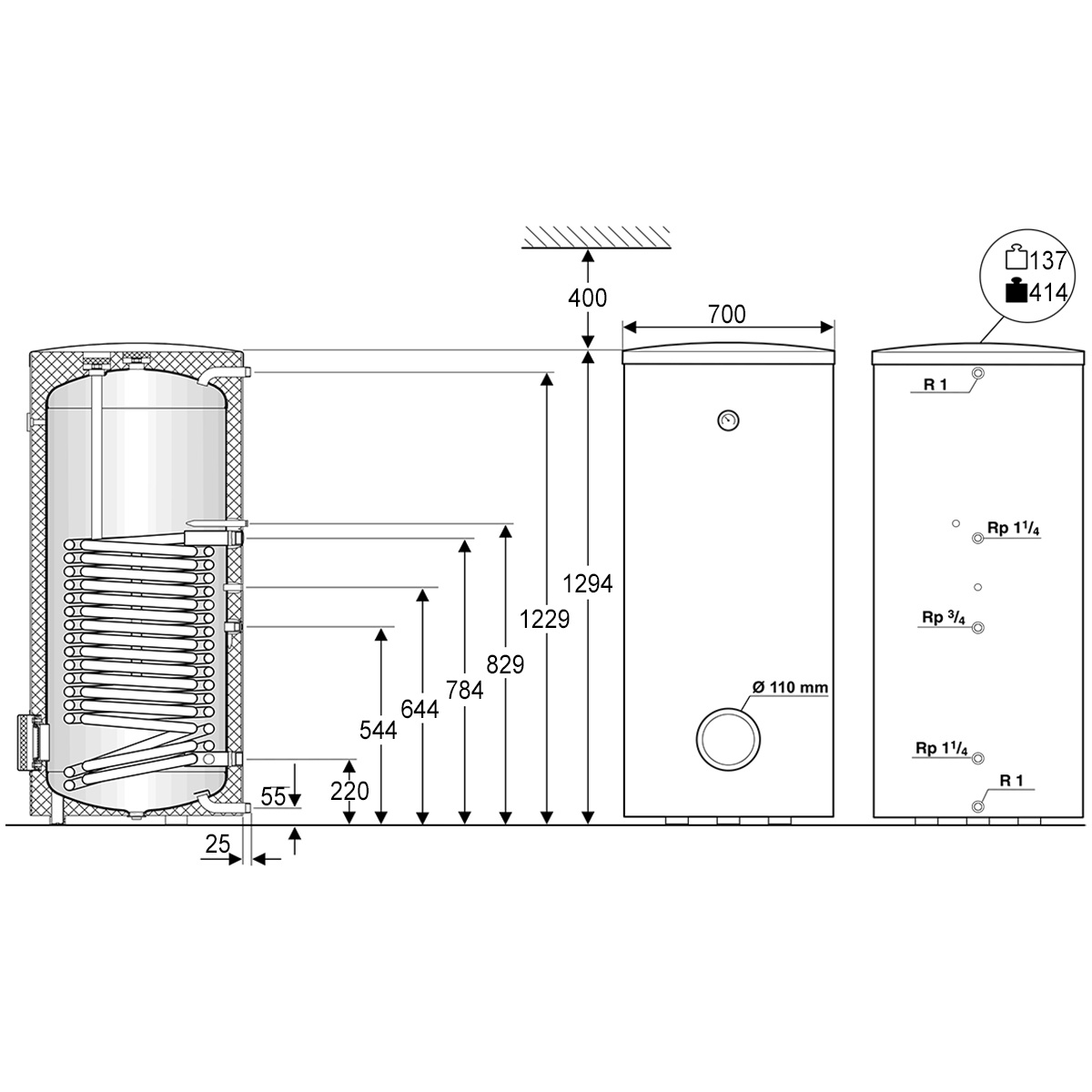 | Wärmeübertrager (Wärmetauscher) | Max. Heizflächenleistung bei tV=55°C, tSP=45°C | kW | 11 | |