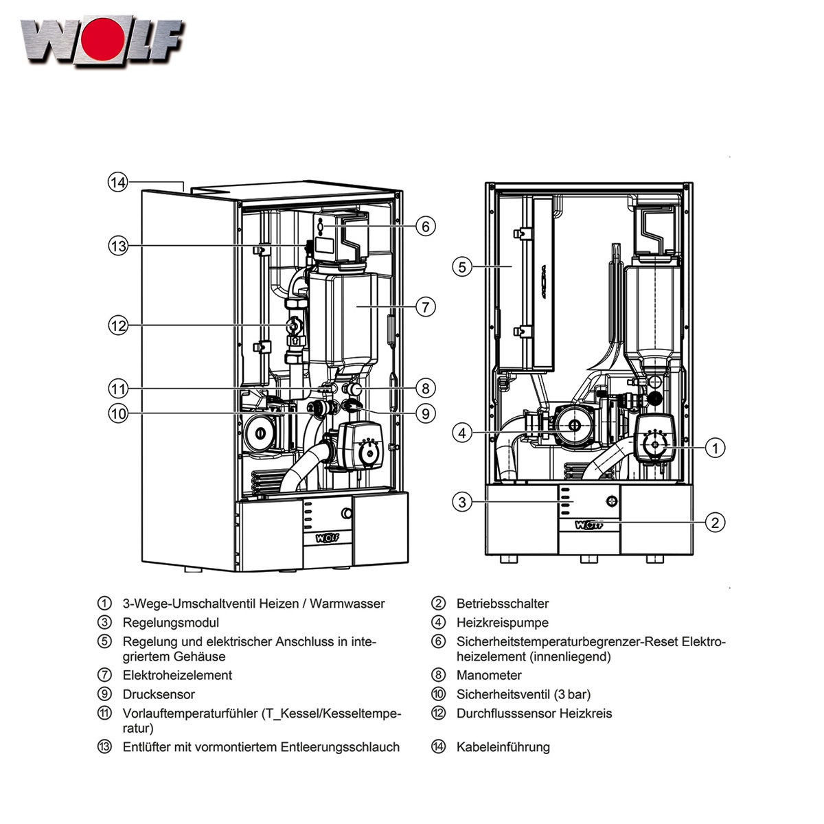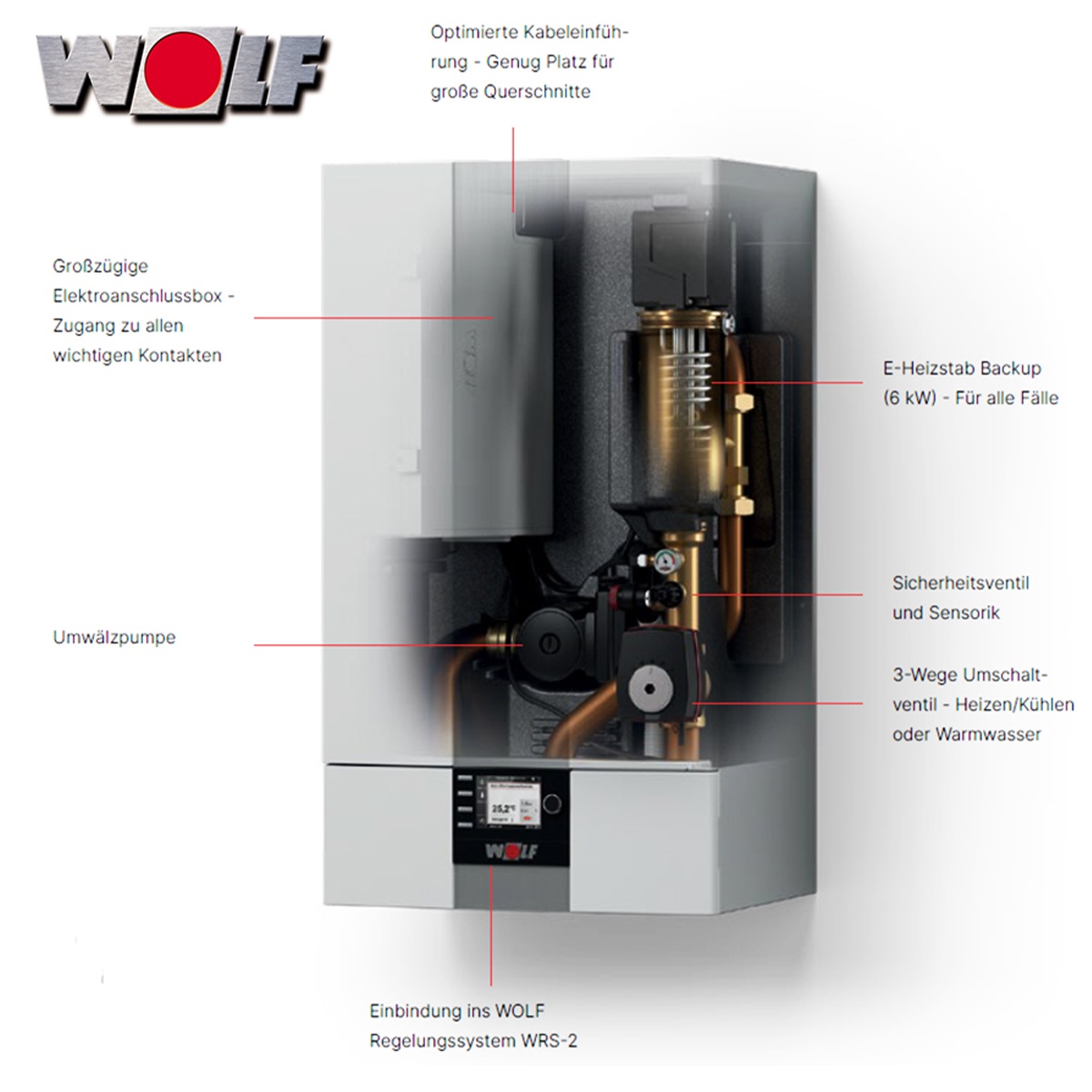 - Voll ausgestattet in solider Monoblockbauweise mit bekannter WOLF Ausstattung (inkl. 6 kW E-Heizstab Backup)