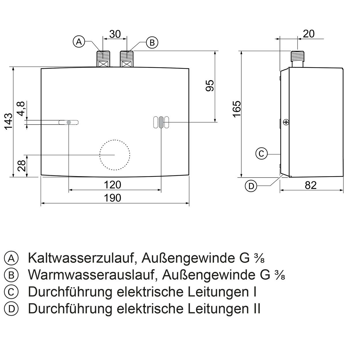 | Wasseranschluss (Außengewinde) | G | 3/8 |