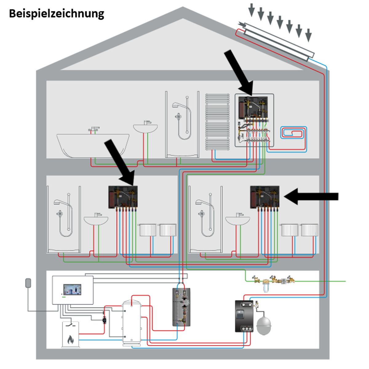 Bitte beachten Sie generell bei Installations- und Montagearbeiten die beigefügten Einbau-, Bedienungs- und Wartungsanleitungen sowie die Produkt- und/oder Systemzulassungen aller Anlagenkomponenten. Beispielsweise ist es bei Wärmeerzeugern regelmäßig der Fall, dass nur für diese Heizung zugelassene Abgasanlagen verwendet werden dürfen. Zur bestimmungsgemäßen Verwendung gehört auch die Einhaltung der Inspektions- und Wartungsbedingungen, die ebenfalls in den oben genannten Unterlagen enthalten sind.
