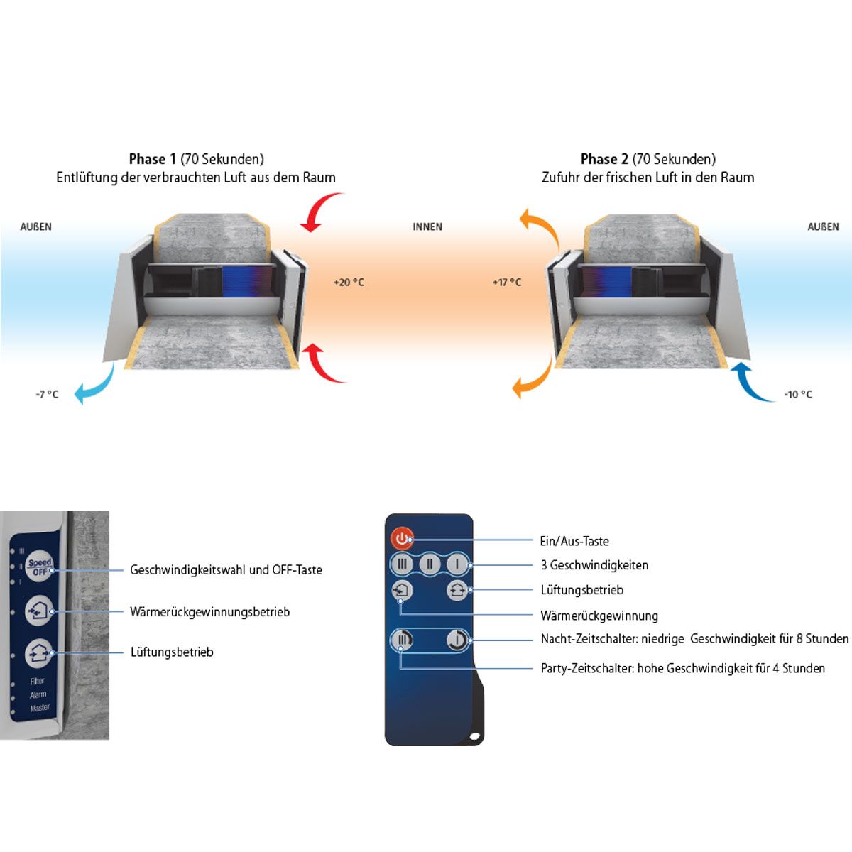 - die Steuerung der Betriebsarten der Lüftungsanlage erfolgt mittels des Bedienfeldes am Gerät oder mittels der Fernbedienung
