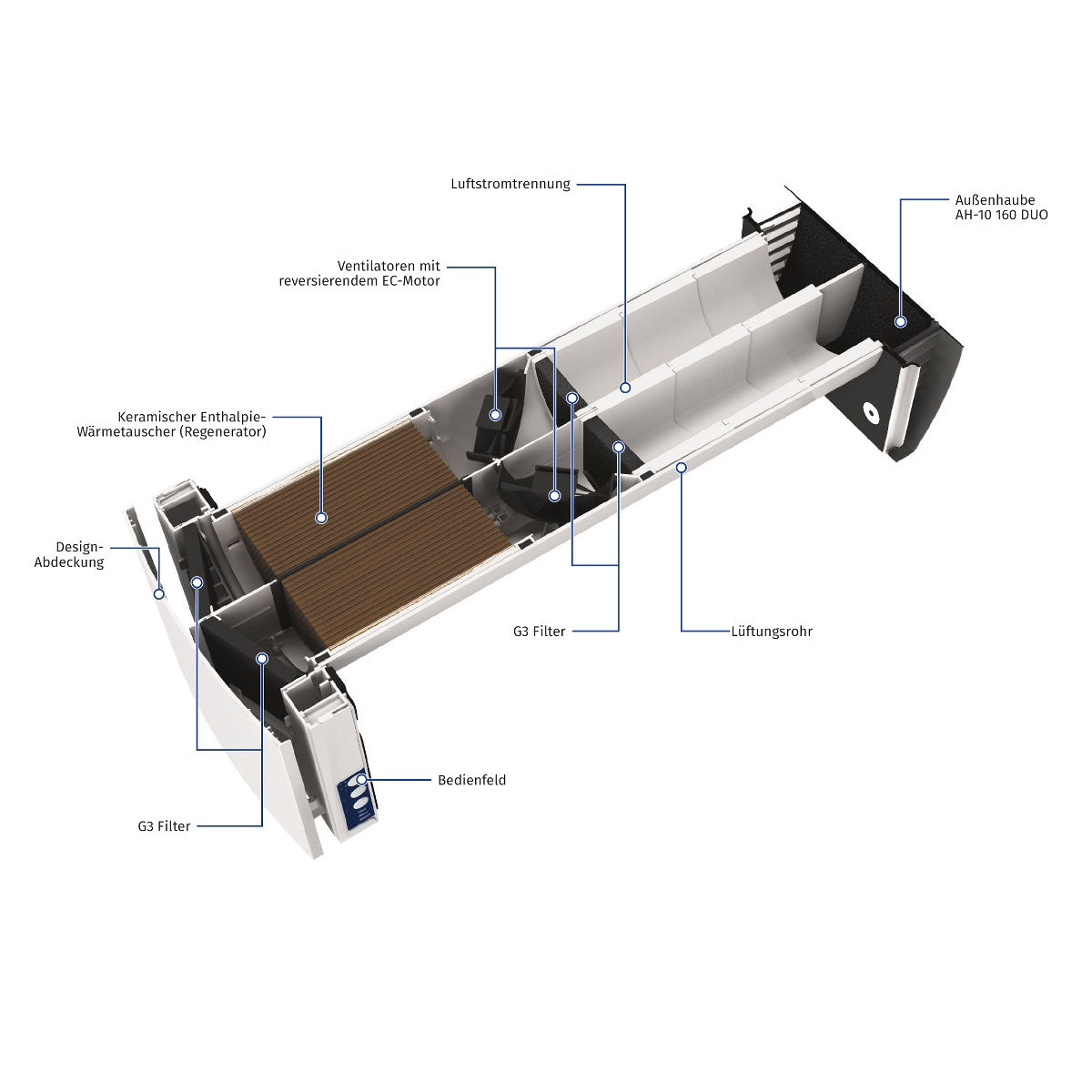 - keramischer Enthalpie-Wärmetauscher (Regenerator) mit antibakterieller Beschichtung und Wärmerückgewinnungs-Effizienz bis 85 %