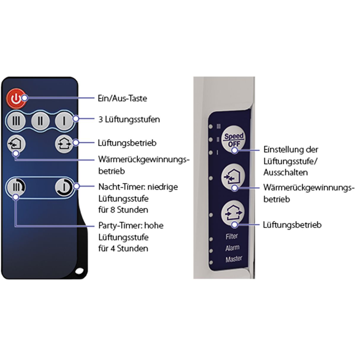 - die Steuerung der Betriebsarten der Lüftungsanlage erfolgt über das Bedienfeld am Gerät oder über die Fernbedienung