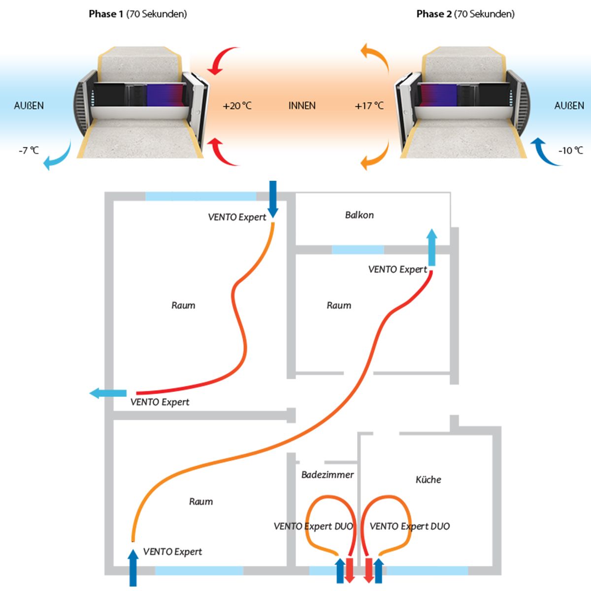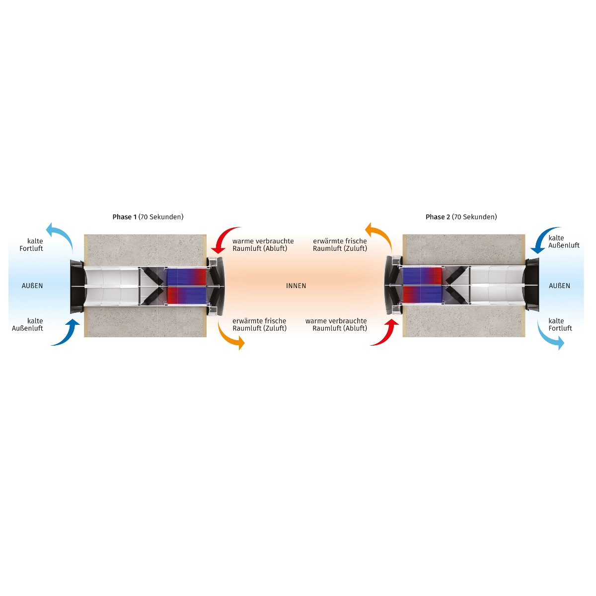 - gleichzeitig läuft der andere Ventilator im Abluftbetrieb und zieht verbrauchte und feuchte Luft aus dem Raum ab