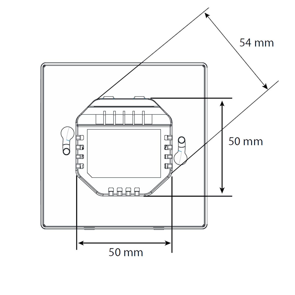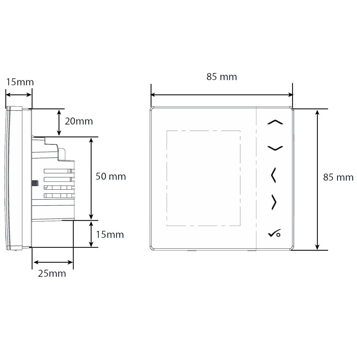 - Funktionen: Box, Sonnig, Bewölkt, Mond, Automatischer Modus (NSB), Frostschutz, Wärmebedarf, Kühlmodusanzeige, Temperaturanzeige, Anzeige für temporäre manuelle Temperaturanpassung, Bodensensor, Einstellung und Tastensperre