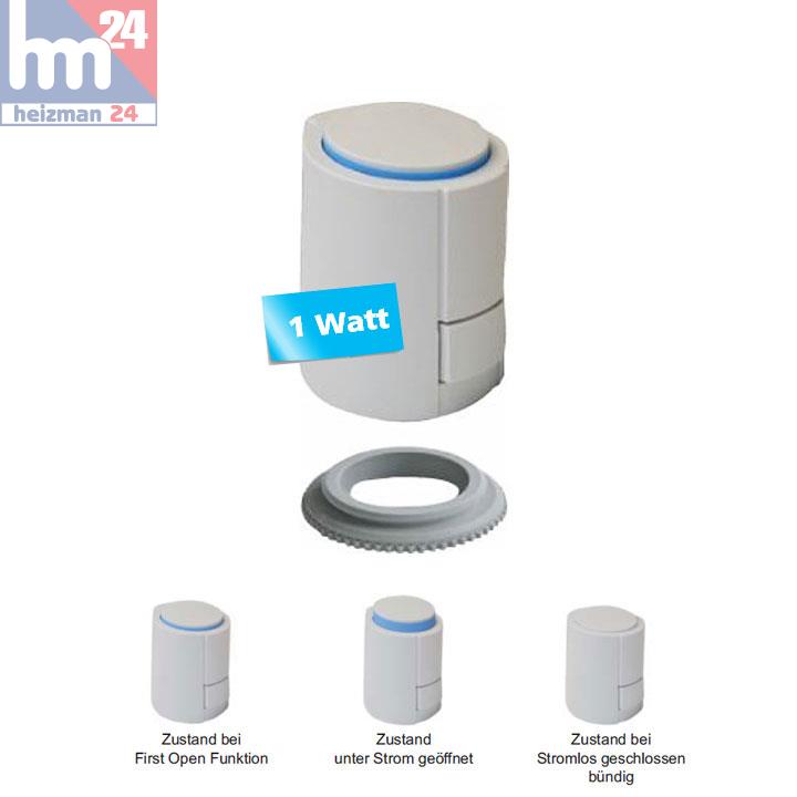 Der Antrieb ist im Lieferzustand durch die „First Open“-Funktion stromlos geöffnet. Dadurch wird der Heizbetrieb in der Rohbauphase ermöglicht, auch wenn die elektrische Verdrahtung der Einzelraumregelung noch nicht fertiggestellt ist. Bei der späteren Inbetriebnahme wird durch Anlegen der Betriebsspannung (länger als 6 min.) die „First Open“-Funktion automatisch entriegelt und der Stellantrieb ist voll funktionsbereit.